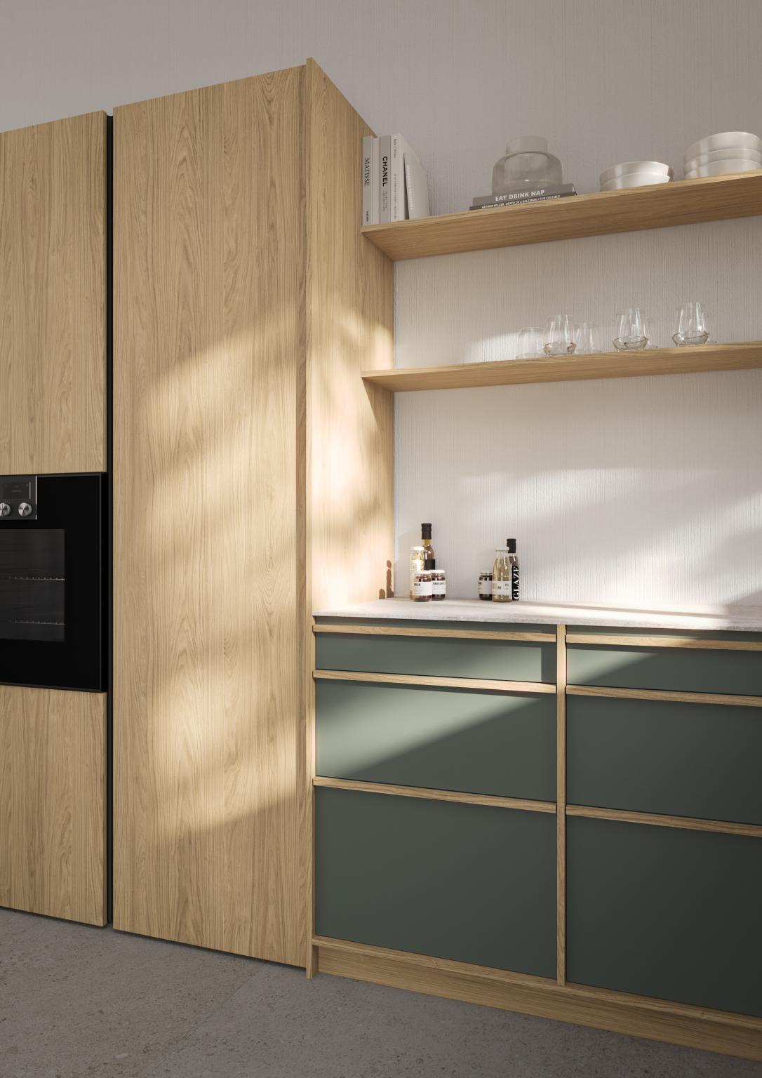 Je nach Farb- und Materialwahl sowie der Anordnung der Schränke von KYOTO entfaltet sich eine völlig andere Wirkung auf die Architektur des Raums. Die erweiterte Palette an Gestaltungsmöglichkeiten erlaubt es, Küchenräume flexibel an unterschiedliche Wohnkonzepte und genau an die Anforderungen der Planenden anzupassen – ohne dabei die bewährten Designprinzipien von KYOTO aufzugeben
